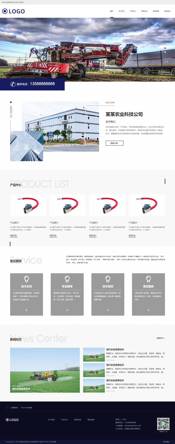 PbootCms农业机械设备类网站自适应模板,pbootcms内核开发的一套企业网站模板,安装后和演示站一样,模板简洁大气,自适应结构。兼容电脑、平板、手机等移动设备。