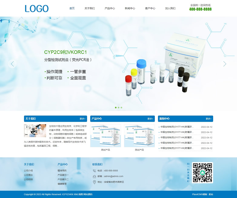 生物科技医疗公司类pbootcms网站模板(PC+WAP),PC+WAP结构网站模板,pbootcms内核开发的一套企业网站模板,安装后和演示站一样,模板简洁大气,pbootcms内核PC+WAP结构。兼容电脑、平板、手机等移动设备。