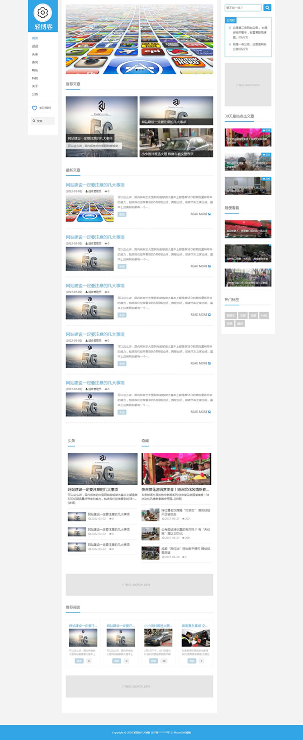 响应式个人博客自媒体自适应网站pbootcms模板,pbootcms内核开发的一套企业网站模板,安装后和演示站一样,模板简洁大气,pbootcms内核自适应结构。兼容电脑、平板、手机等移动设备。